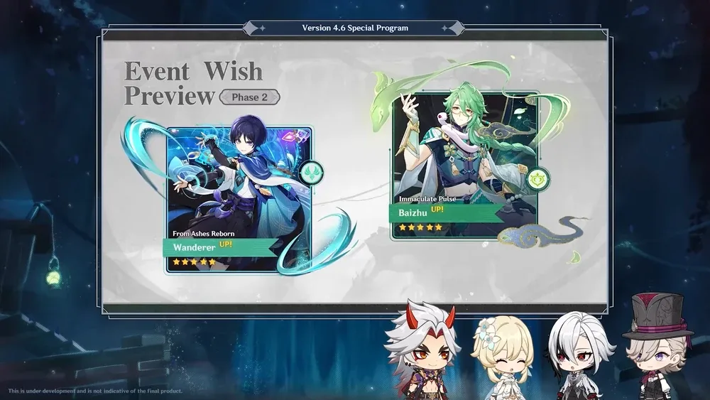 In Phase II, which will last from May 14th to June 4th, the character event wishes ‘From Ashes Reborn’ and ‘Immaculate Pulse’ will return, bringing back Wanderer and Baizhu respectively for their second reruns. The featured 4-star characters for these banners will be revealed closer to the time. Meanwhile the weapons banner for this phase will likely feature the 5-star catalysts ‘Tulaytullah's Remembrance’ and ‘Jadefall's Splendor’ as the signature weapons to accompany their associated characters Wanderer and Baizhu respectively.