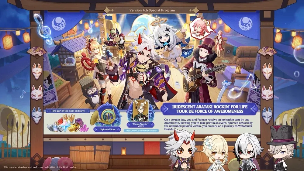 The flagship event for this version is the ‘Iridescent Arataki Rockin' For Life Tour de Force of Awesomeness’ which will start on May 6th and be available until May 27th. Arataki Itto is well-known in the fandom for his rather eccentric personality and this shows in the kind of events he is centred in, from his ‘Great and Glorious Drumalong Festival’ in 2.7 to his ‘Blazing Armor Beetle Battle Boot Camp’ in 4.3. This will be Itto’s first time in the spotlight with a flagship event for a version, and appears to be a music event that takes place on Watatsumi Island in Inazuma, and features the return of Dvorak, who was last seen at the Lantern Rite Festival in 3.4. Completing all the event objectives will also earn players the character Gorou for free.
